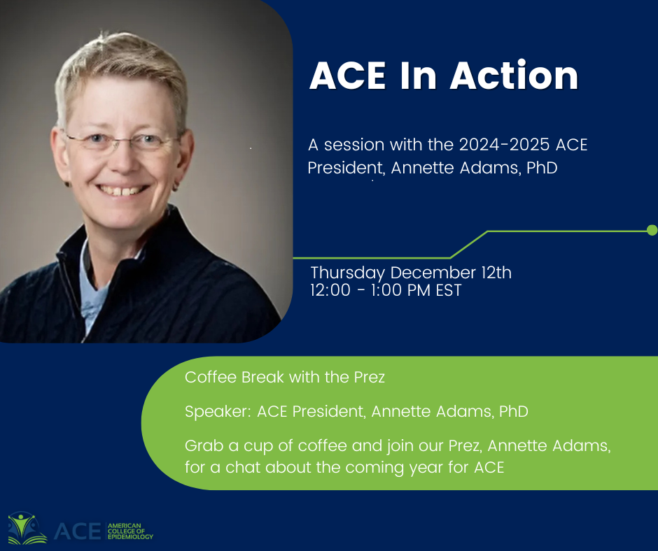 Grab a cup of coffee and join American College of Epidemiology's (ACE), President, Annette Adams, for a chat about the coming year. Click here to register for the webinar.